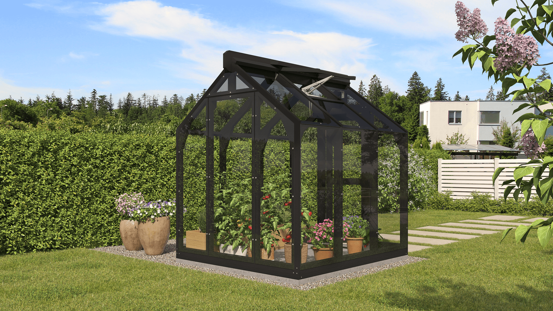 Drivhuset er utstyrt med fullt justerbare 3D-hengsler, dørlås og en automatisk vindusåpner fra Bayliss.