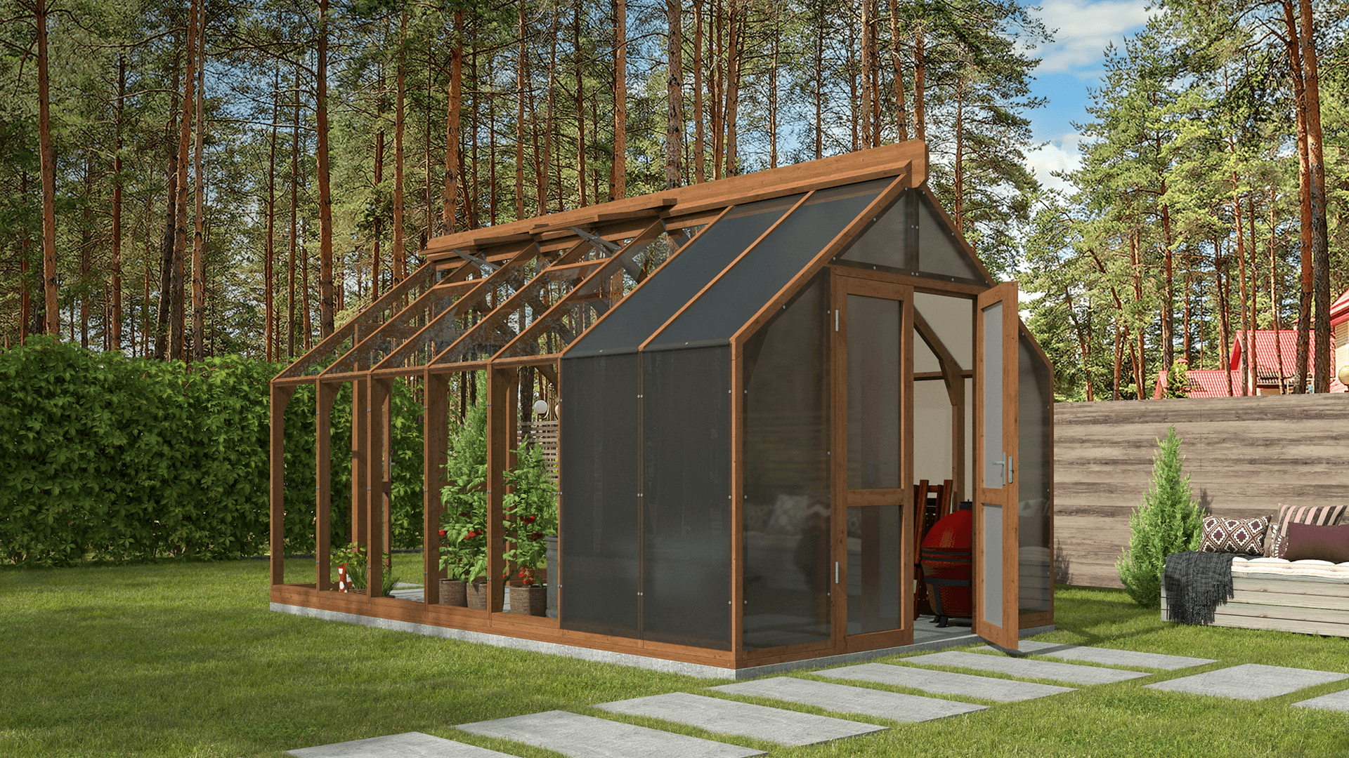 Greenhouse frame is made of resilient Thermowood or Accoya wood.